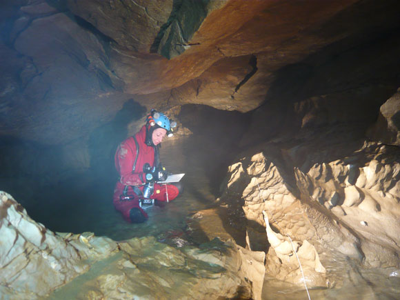 Abbiamo fatto una prima immersione raggiungendo un sifone aereo che arriva in una grande sala con un pozzo di circa 10 metri da cui scende una cascata; l’obiettivo di oggi è portare il materiale necessario per mettere in sicurezza la cascata e risalirla con la possibilità e l’augurio che vi sia una prosecuzione.