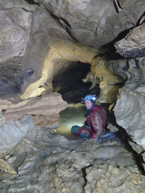 Davide inizia a risalire la parete in artificiale, mentre io gli faccio sicura e Luca sistema la telecamera e i fari per le riprese esterne. Una volta fissata la corda indossiamo gli imbraghi e risaliamo il pozzo. Davanti a noi si apre un’enorme galleria orizzontale, siamo così felici che urliamo come bambini dalla gioia.