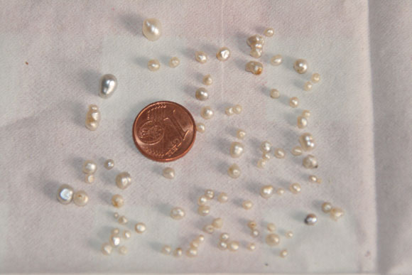 Una ventina di anni fa, a Hurgada in Egitto sul mar Rosso, ho trovato un’ostrica perlifera (Pinctada Margaritifera “credo” erythrensis) con all’interno 85 piccole perle e con in più molte mezze perle nel mantello su entrambe le valve. Di questo ritrovamento e dell’estrazione ho anche il filmato; inoltre sono in possesso della certificazione con radiografie di perle e conchiglia effettuata del CISGEM – Centro Informazione e Servizi Gemmologici di Milano.