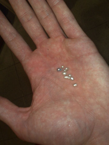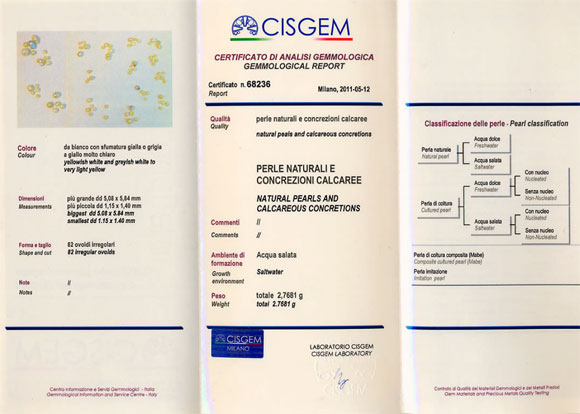 Devo precisare che le piccole perle che ho trovato erano 85 ma una l’ho data alla ragazza presente al ritrovamento, mentre 2 sono andate perse. Per questo motivo la certificazione riguarda 82 “ovoidi irregolari” (complessivamente c.a 14 carati, corrispondenti a più di 55 grani), che sono tuttora in mio possesso. Nella certificazione si parla di perle e concrezioni calcaree: sono tali quelle piccole formazioni che, pur non avendo le sufficienti stratificazioni tali da definirle vere e proprie perle, sono comunque composte di madreperla (aragonite) al pari delle altre formazioni perlifere.
