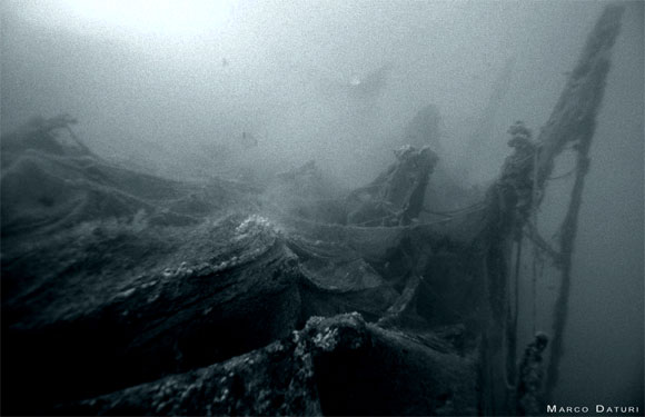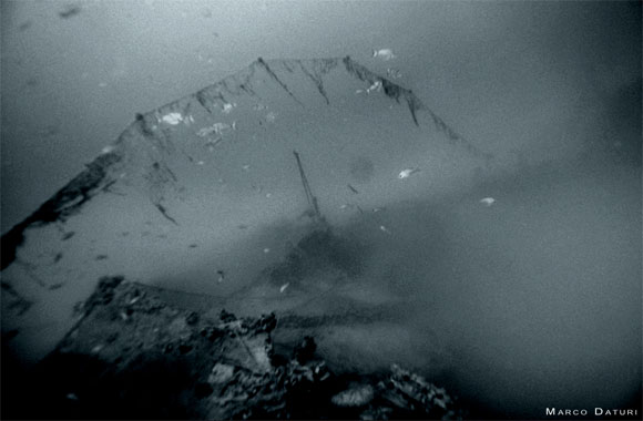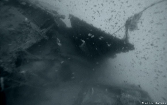 Mentre scendiamo per i primi metri il pessimismo e la ridotta visibilità ci portano a pensare che non saremo noi un’eccezione alla regola. Continuiamo a scendere e, con grande sorpresa, intorno ai 30 metri la visibilità si apre tanto da lasciarci intravedere la sagoma confusa del relitto e cominciamo la nostra esplorazione.