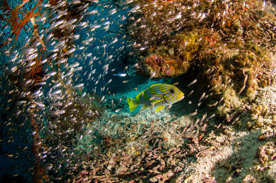 Le sue acque, infatti, ospitano un’incredibile varietà di flora e fauna marina, con meravigliose barriere coralline ancora incontaminate, pesci di ogni forma e colore, tartarughe, mante, squali, delfini, squali balena, carangidi, barracuda, wobbegong shark, bamboo shark, per non parlare delle quantità di specie di pesci appartenenti al mondo della macro, come il cavalluccio pigmeo, i nudibranchi e tanto altro ancora.