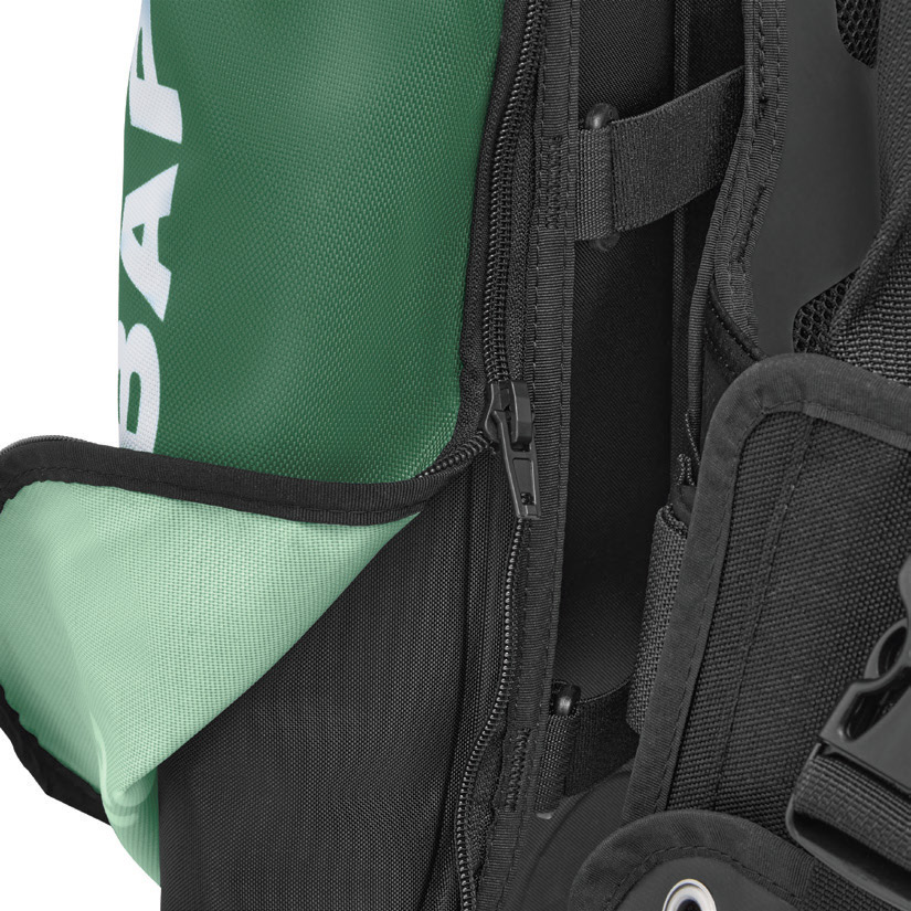 - Tasche rimovibili con doppia funzione: apertura verso l’alto per accessori, verso il basso per la zavorra a sgancio rapido.