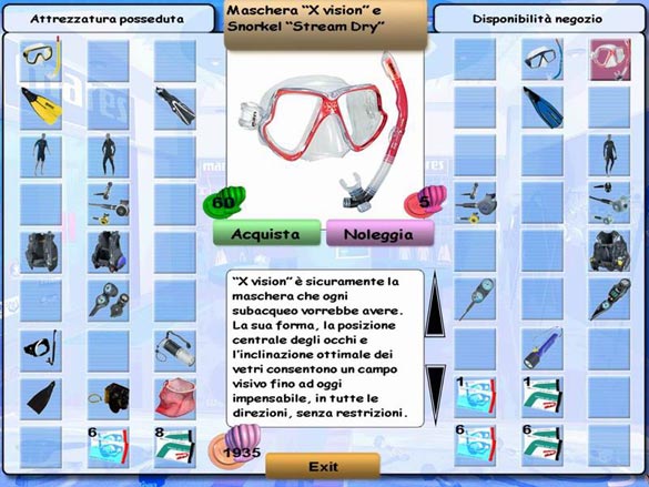 Ma per immergerci avremo bisogno delle attrezzature adatte e Antonio è la giusta persona a cui rivolgersi anche in questo caso. Nel suo Diving Center infatti è possibile affittare e acquistare ogni tipo di equipaggiamento subacqueo a noi necessario. In base alla nostra esperienza, agli obiettivi di missione ed al luogo di immersione, sceglieremo come investire le nostre "conchiglie finte" nell’attrezzatura che meglio di adatta alle nostre esigenze del momento.