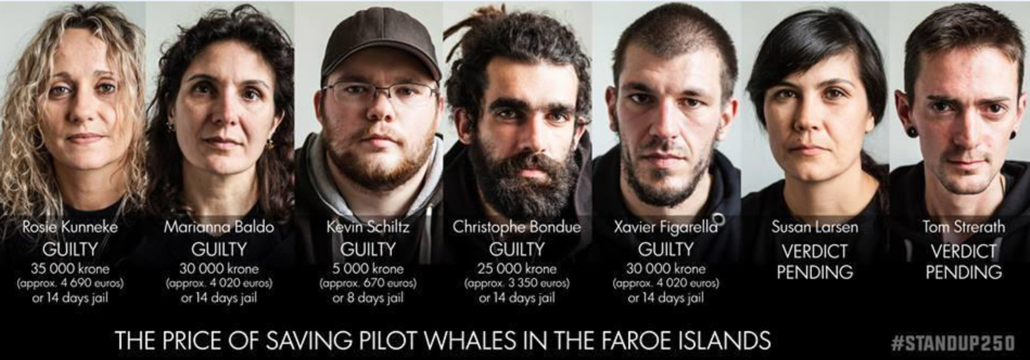 Bondue è stato condannato al pagamento di una sanzione ministrativa di 25.000 corone faroesi (circa 3.350 euro) o a 14 giorni di carcere. Xavier Figarella, cittadino corso (Francia) e l’italiana Marianna Baldo sono stati arrestati mentre stavano documentando il massacro di Bøur dal piccolo tender su cui si trovavano. Entrambe sono stati condannati al pagamento di una sanzione amministrativa di 30.000 corone faroesi (circa 4.020 euro) o a 14 giorni di carcere.