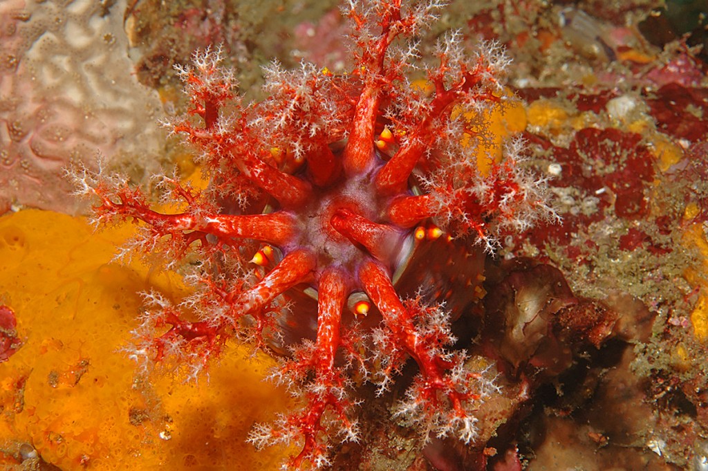 Nella foto sopra vedete l’animale ripreso di lato. Qualcuno la chiama mela di mare (sea apple), credo per la forma tondeggiante (atipica per un’oloturia) e per i colori vivaci.