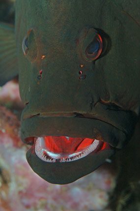 A sinistra. La strana pigmentazione della cernia bocca rossa Aethaloperca rogaa.