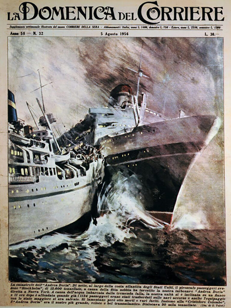 La vita dell’Andrea Doria – il nome era un omaggio al celebre ammiraglio Andrea Doria, principe e padre della patria della Repubblica di Genova – fu stroncata nella notte tra il 25 e 26 luglio 1956. Partita dal capoluogo ligure verso New York, dopo una settimana di navigazione, all’altezza del battello-faro di Nantucket, a 200 km dalla Grande Mela, alle ore 23.10 fu speronata dal transatlantico svedese Stockholm e affondò alle 10.15. Pesantissimo il bilancio della tragedia: 51 morti di cui 46 passeggeri dell’Andrea Doria – alloggiati per la maggior parte nelle cabine investite dalla prua della nave svedese – e 5 della Stockholm.