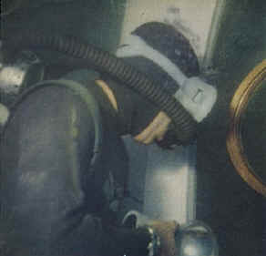 Al mattino ci svegliamo, al momento in cui sentiamo il motore rallentare. Schizziamo tutti fuori quasi nello stesso momento. Fuori ci accoglie un cielo velato dalla nebbia, ma il mare é calmo e la visibilità in superficie sembre buona. Forse la ruota della fortuna ha perso la nostra direzione? Subito Capt. Hank e Lee, si preparano per fissare sul relitto la cima di discesa. Come al solito dalla loro cintura pendono gli attrezzi del mestiere del subacqueo tecnico esperto in relitti ammerlock, mazzetta in metallo, scalpello, cesoie e piede di porco. Strano però che in tutti i manuali anche americani, nelle attrezzature necessarie per l’immersione di questo tipo, non le abbia mai trovate. Dal momento dell’entrata in acqua, passano circa due ore prima del ritorno dei subacquei in superficie. Trepidanti domandiamo informazioni sulla situazione trovata in profondità. Ci viene chiesto come sempre di attendere che prima si devono riunire con il resto dell’equipaggio.Mangiafuoco é risalito in barca affollato, non ci dice niente, ma corre a prua. Dopo alcuni minuti andiamo a vedere, e lo troviamo che sta respirando ossigeno. Che cosa é successo? Very Hard Dive!!! Può essere che sul fondo ci sia la fomosa corrente fortissima di cui ci hanno sempre parlato? Controlliamo il suo bibo, ed é praticamente vuoto. Si é succhiato per 15/20 minuti di tempo di fondo un bibo 18+18 caricato a 270 bar!!! Ma………