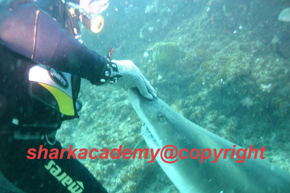 Scendiamo a -20 circa, in una sorta di anfiteatro naturale su un fondale sabbioso. Qui, stando accucciati sul fondo, la corrente si limita ad una forte risacca che risulta però molto fastidiosa, specialmente se si devono fare delle riprese. In una piccola caverna troviamo il primo raggie: una femmina di due metri che si muove, come tutti gli squali toro, con una lentezza disarmante e che non sembra per nulla infastidita dalla nostra presenza. I suoi occhietti minuscoli mi scrutano mentre cerco di inquadrarla nell’obbiettivo della videocamera e non posso fare a meno di notare la sua caratteristica espressione “cattiva” fatta di denti lunghi, aguzzi e portati fuori dalla bocca in un ghigno sinistro. I raggie, però, nonostante il loro aspetto, se non molestati, non sono aggressivi e lo so bene. Riccardo, il capo spedizione, è pronto a marcare il primo squalo che gli capiti a tiro, così prendo in consegna la sua Canon EOS scafandrata Nimar e cedo la cinepresa a Walter. I minuti scorrono veloci e assisto, attraverso l’obbiettivo della macchina fotografica, al carosello di squali toro che avvicinano cautamente la sardina che Riccardo stringe nella mano protetta da un guanto di acciaio, per poi far scattare fulmineamente le mascelle nel tentativo di agguantarla. E’ invece Riccardo ad agguantare la loro pinna dorsale nella quale conficca la punta di acciaio della pistola marcatrice per inserirvi il TAG.