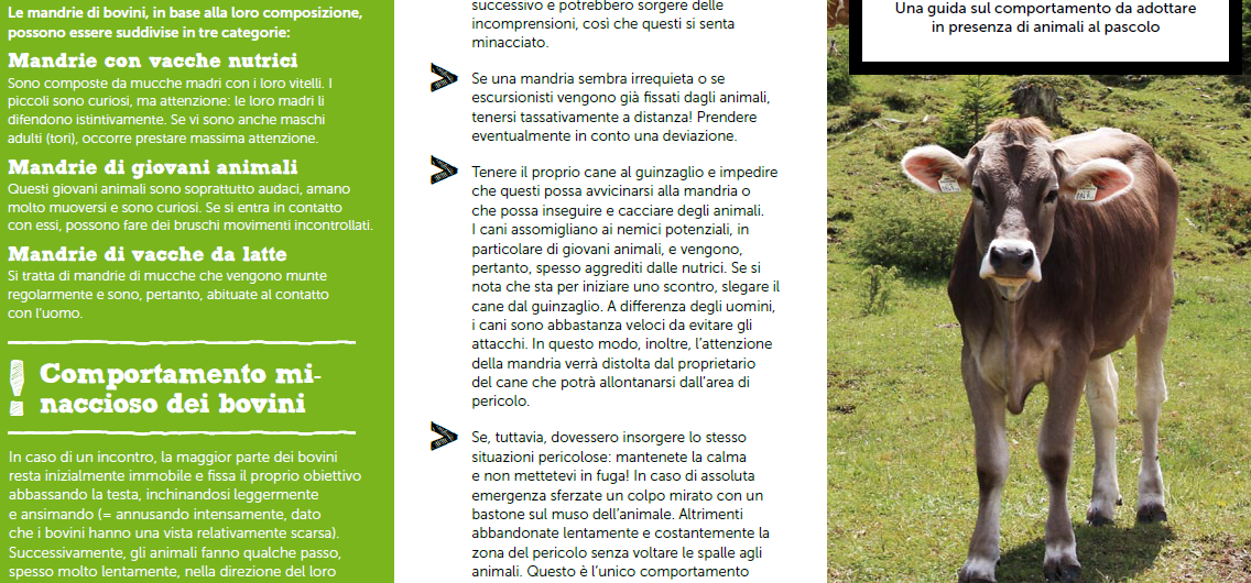 Nel frattempo ecco volantini e consigli su come evitare aggressioni, come riconoscere una mucca aggressiva eccetera. Vi segnaliamo, per praticità linguistica, l’opuscolo della provincia di Bolzano. Quello in Italiano.