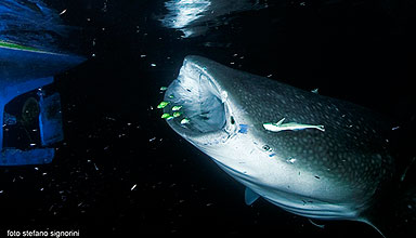 davanti un giovane di squalo balena di un paio di metri. Tutti gli altri,