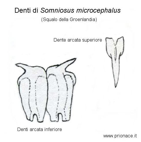 I denti sono diversi nelle due arcate, in quella superiore sono sottili e appuntiti, mentre in quella inferiore più larghi, resistenti, con la cuspide (punta) spostata verso l’esterno. Lo squalo di Groenlandia si nutre sia di carcasse di mammiferi marini che di vere e proprie prede, da inseguire e catturare, come pesci ossei, foche e focene.