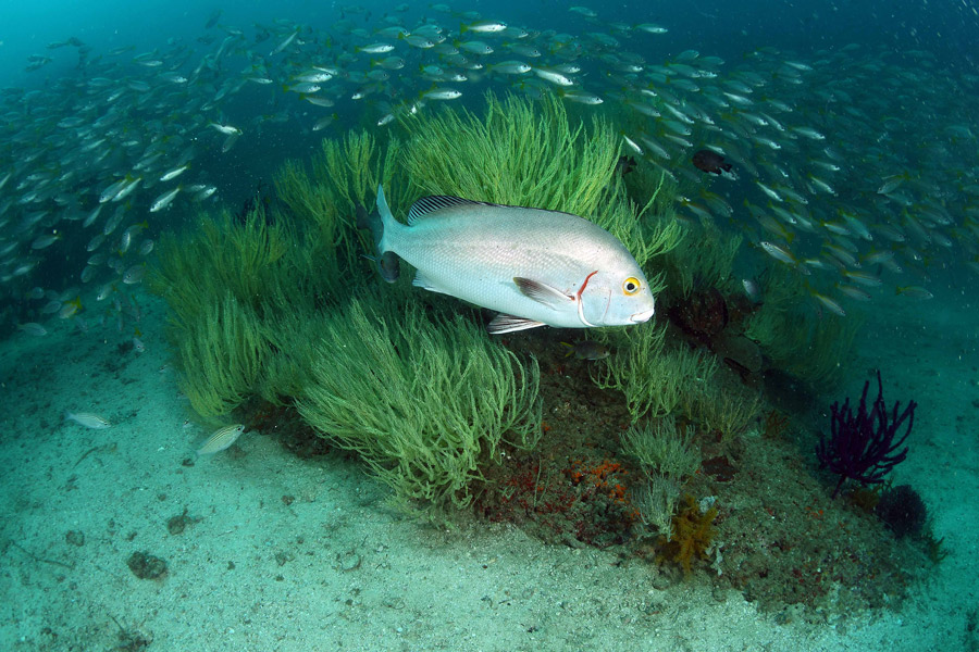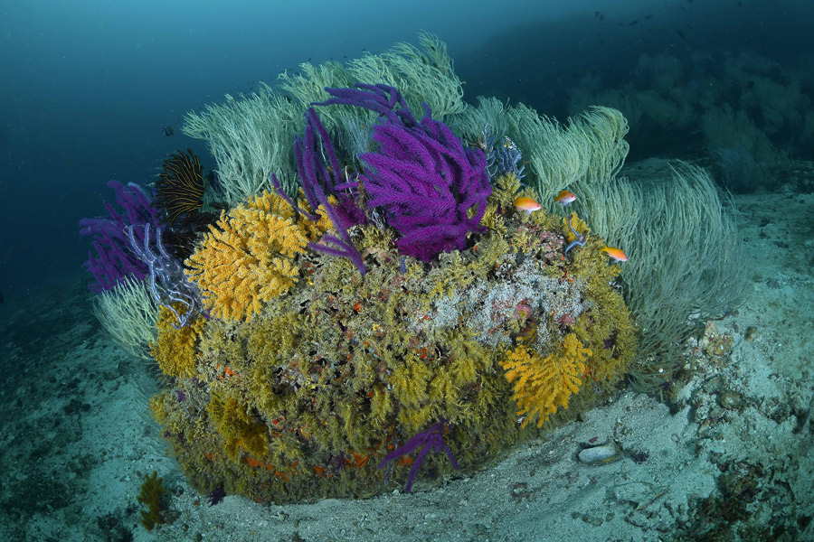 La coreografia è arricchita da un movimento di pesci fucilieri e altri pesci azzurri veramente incredibile. Nuvole argentee che si muovono perennemente per disorientare i grandi dentici predatori. Tra i massi caduti dall’isola si aprono stretti canyon colonizzati di gorgonie che quasi intrecciano i loro candidi rami, ottimi spunti per scatti verticali col grandangolo.