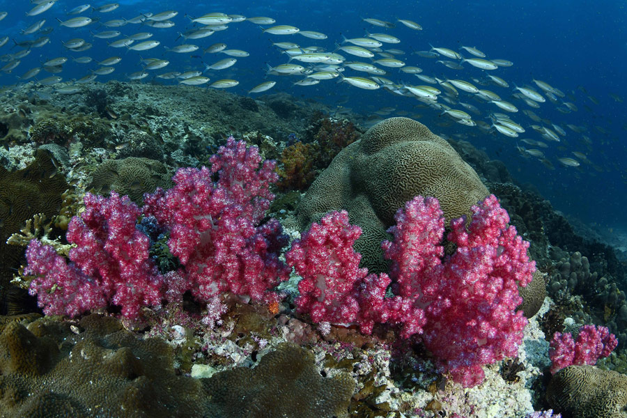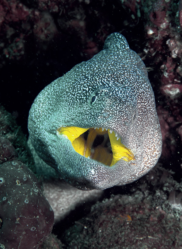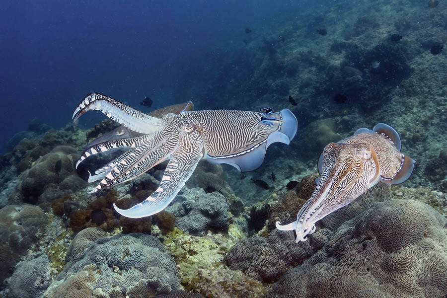 I fondali arrivano a una profondità massima di 25-30 metri, quindi sono adatti a tutti i livelli di esperienza. La prima immersione è la notturna in un sito il cui nome è tutto un programma: Aquarium, una piccola secca con il sommo a 7 o 8 metri, dove si ormeggia per la notte. È il top per un fotografo: acqua bassa, calda, abbastanza limpida, una miriade di soggetti. Con due scalini il cappello della secca scende a 22, 25 metri. Costeggiando a destra o sinistra la parete, secondo la corrente, si torna inevitabilmente al punto di partenza. Sulle pareti vi sono parecchie tane con murene, granchi, ricci, stelle e ogni ben di Dio. Il fondo sabbioso intorno ai 22, 23 metri ospita un paio di grossi trigoni, piuttosto diffidenti, che scappano dopo un paio di flash. Il sommo è ricco di soggetti, murene leopardo fuori tana, tartarughe quasi addomesticate, murene zebra, banchi di triglie enormi, svariate coppie di seppie in amore che non avrei più smesso di osservare. Grossi barracuda solitari, banchi immensi di pesci fucilieri e gli immancabili platax adulti e giovanili che vi seguono per tutta l’immersione. Persino i pesci lima, Aluterus scriptus, solitamente soggetti ostici per i fotografi, qui sono domestici e consentono ottimi scatti. Cosa volere di più?