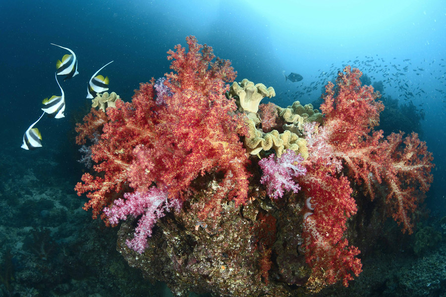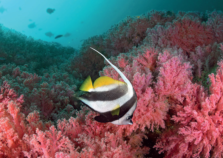 La seconda immersione è stata pianificata sotto la parete nord dell’Isola di Fahal, che cade in verticale per 7 o 8 metri e fa un primo ampio gradino che, a sua volta, scende sui venti. L’isola è di natura calcarea, piuttosto friabile. Ciò ha causato negli anni la caduta di molti massi in mare, che hanno formato il substrato per una fauna sessile strabiliante. Mai nella mia vita avevo visto tanti alcionari, fittissimi, rigogliosi e di ogni colore e sfumature. Tra i 6 e i 10 metri si susseguono massi completamente colonizzati, avvolti da pesce corallino di tutte le specie. Un vero paradiso per i fotografi!