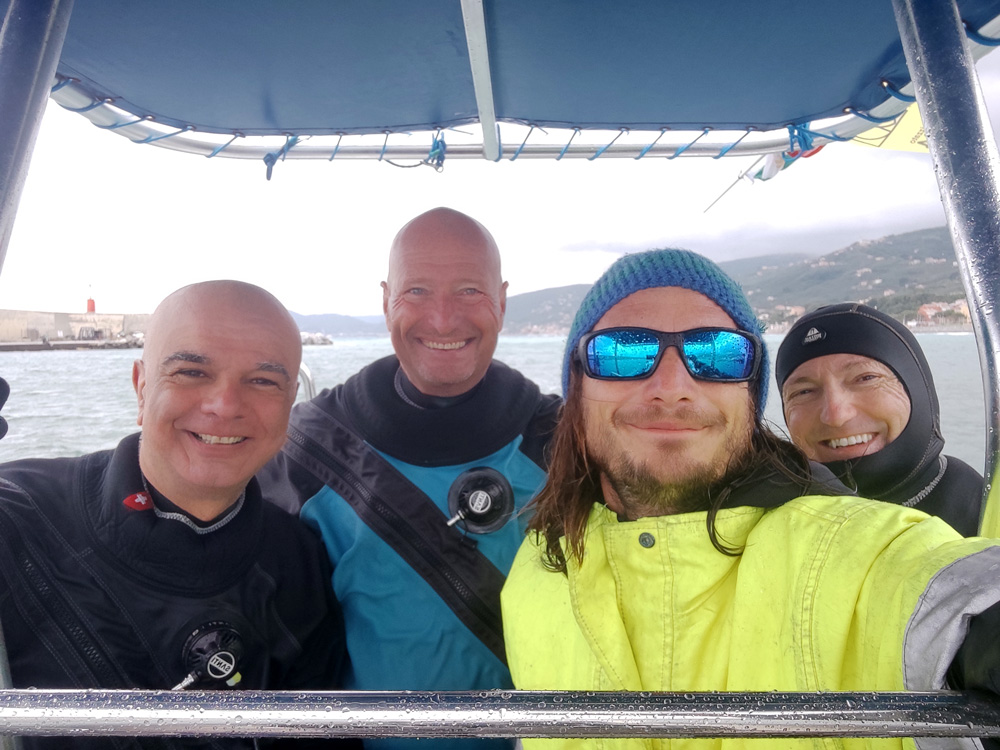 Il giorno dopo le condizioni del mare non ci hanno permesso di uscire e abbiamo dedicato l’intera giornata alla teoria, completando l’intero programma. Giovedì mattina il mare era ancora formato ma abbiamo deciso lo stesso di uscire. Avevamo la garanzia di avere a bordo Alessandro Boschi, titolare del Massub, che ha gestito in modo impeccabile la situazione impegnativa facendoci scendere in acqua uno alla volta e passandoci le nostre bombole, per poi allontanarsi dalla costa e restare nelle vicinanze in “libera”, per sorvegliare il tratto di mare e poterci recuperare in caso la corrente ci avesse trascinato distante. L’immersione si è conclusa perfettamente rispettando il runtime concordato e all’uscita dall’acqua, altra manovra di recupero gestita magistralmente da Alessandro.