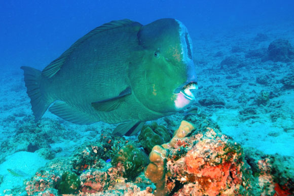 pesci Rinoceronte. Questo grande pappagallo, che spacca il corallo con il suo