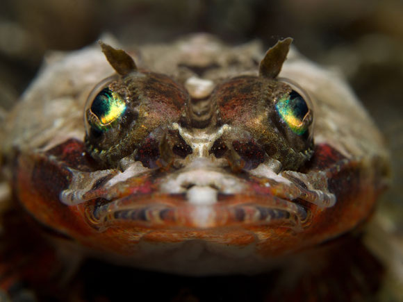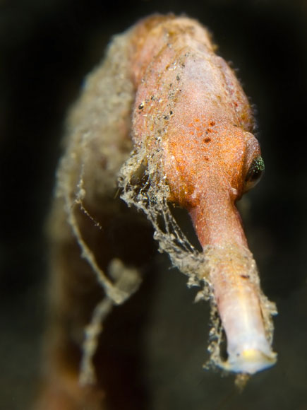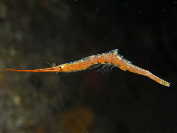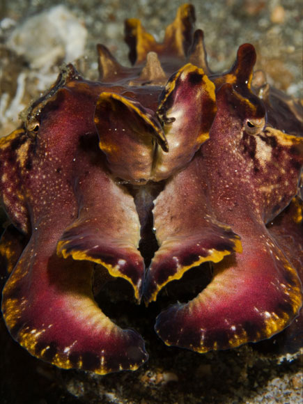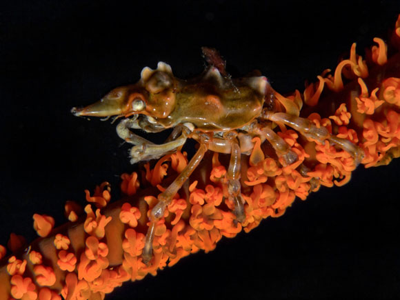 Qui la magnificenza della natura qui si sprigiona in tutta la sua stranezza e creatività: frog fishes arancio che “sbadigliano” sornioni all’ombra di magnifici spirografi; polpi tropicali per nulla timidi che si divertono a costruire le proprie case con conchiglie e gusci di noci di cocco; minuscoli gobidi dorati che proteggono le proprie uova appena deposte nel collo di bottiglie abbandonate; rari pesci scorpione di Ambon che si muovono lentamente tra morbide alghe; timidi pesci ago fantasma che cercano di mimetizzarsi tra i tentacoli di gigli di mare; e poi ancora decine di nudibranchi colorati e mimetici, gamberetti di Coleman su ricci di fuoco, piccole seppie dalla coda mozza dai riflessi blu metallici; gamberetti imperatore rosso vivo che camminano tranquilli sul corpo di oloturie ocra intenso.