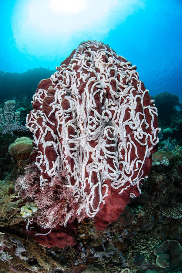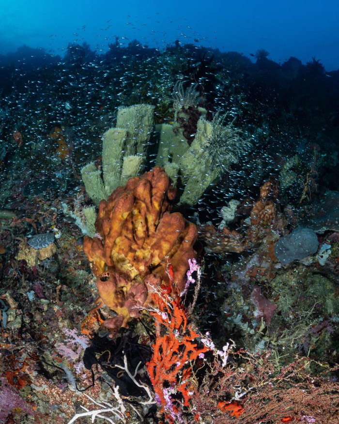 Il punto forte di questo sito sono le grandi spugne, spesso ricoperte di cetrioli di mare bianchi che danno alle spugne l’effetto di una decorazione.