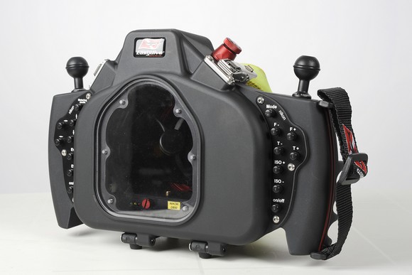 La custodia che testo è per una Nikon D800 e al equipaggio con i miei vecchi e pesanti flash: un Subtronic Alpha e una Ikelite 100. Sono abituato ad avere la macchina a tracolla anche sott’acqua ma questa volta uso solo il lacciolo per tenerla ferma alla mano destra senza altre sicurezza anche se il test è fatto durante una immersione notturna con il mare un po’ mosso.