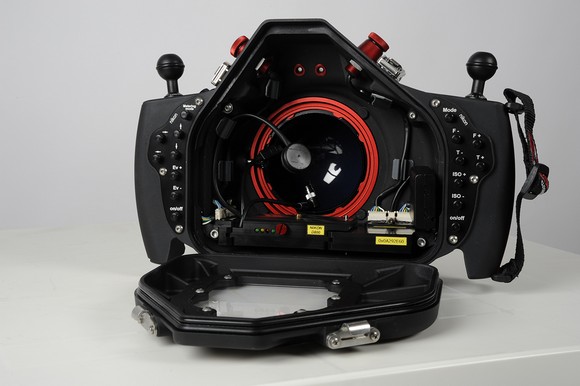 Esteticamente è molto accattivante con linee sinuose, il colore grigio satinato con particolari e linee rosse che si staccano dal colore di fondo rendono la custodia subito riconoscibile e si nota il gusto italiano nel design; aprendo la custodia, sganciando da prima i due grossi ganci in alluminio e poi facendo pressione su di essi con i palmi delle mani si apre il dorso liscio con un’ampia finestra in plexiglass senza pulsanti o latri comandi dove campeggiano due O-Ring di tenuta radiale. Guardando all’interno c’è un bell’ordine, i cavi dei connettori flash scorrono sulle pareti della custodia per raggiungere la centralina elettronica posta sul fondo della custodia, di