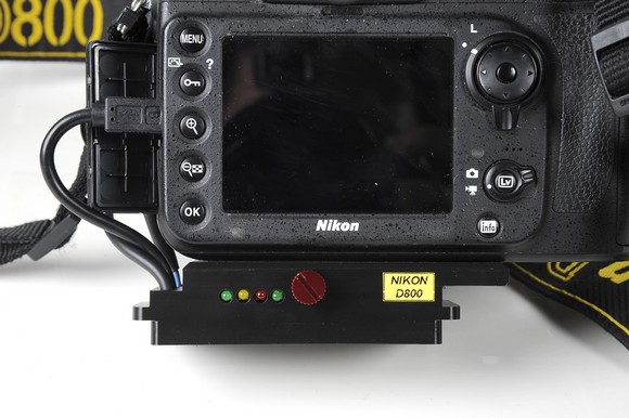 La slitta della dove va applicata la macchina contiene una scheda elettronica con tre cavi che vi fuoriescono: uno per far scattare i flash attaccati ai connettori flash tradizionali ed è asportabile, un cavo che va inserito nella presa di scatto flessibile e uno che fa alla presa USB della macchina. La slitta deve essere inserita con precisione altrimenti si impunta perché stiamo sbagliando, una volta inserita correttamente la teniamo in posizione con una vite rossa, mentre la spina dei contatti si attacca a quella della centralina.