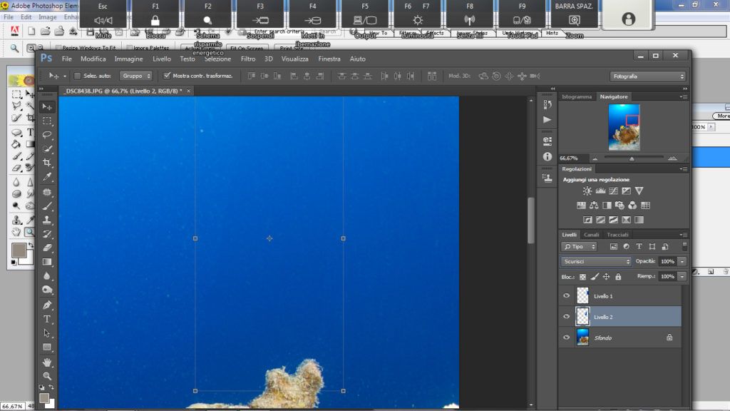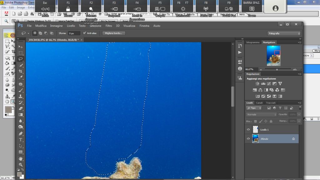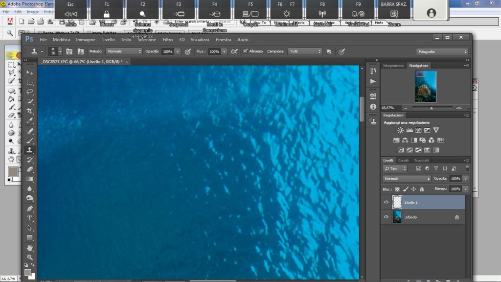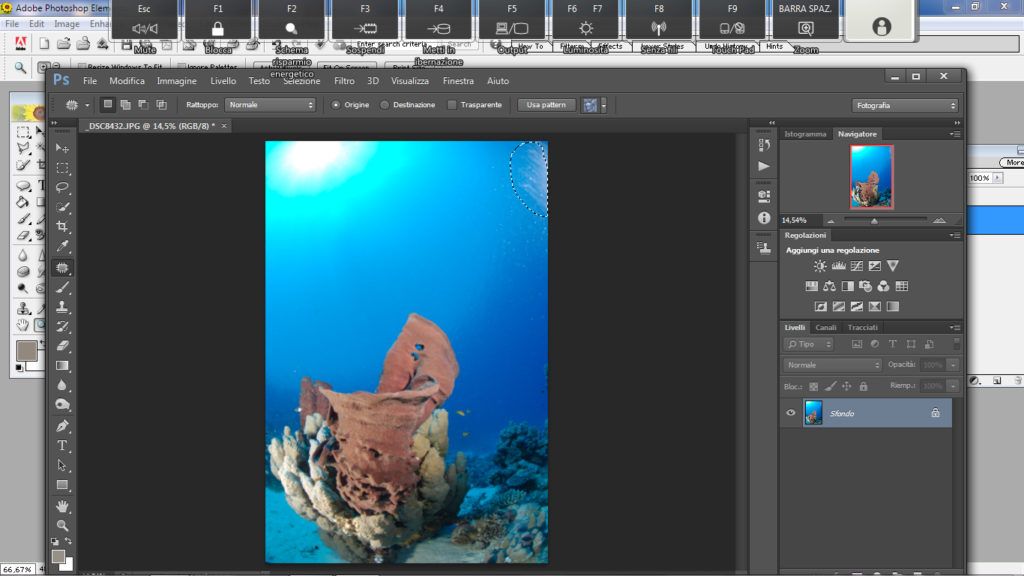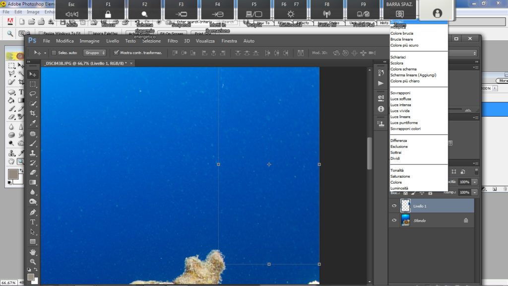 Questo metodo è utile nella fotografia ambiente quando si ha sospensione un po’ distanziata ma su tutto il blu. Questo è un metodo più complesso rispetto agli altri. Per prima cosa selezioniamo lo strumento “lazo” andiamo a selezionare l’area o una porzione di essa se l’area da correggere è ampia, attenzione a non selezionare rocce o pesci, ora facciamo il classico copia e incolla (ctrl+C, ctrl+V) così Photoshop creerà un livello con la parte selezionata, ora su questo nuovo livello andiamo a cambiare il metodo da “normale” a “scurisci”, fatto questo prendiamo lo strumento “sposta” e selezioniamo il livello che è stata creato e spostiamo la selezione in alto o in basso a piacimento con le frecce “su” o “giù” presenti nella tastiera finchè la sospensione non scompare.