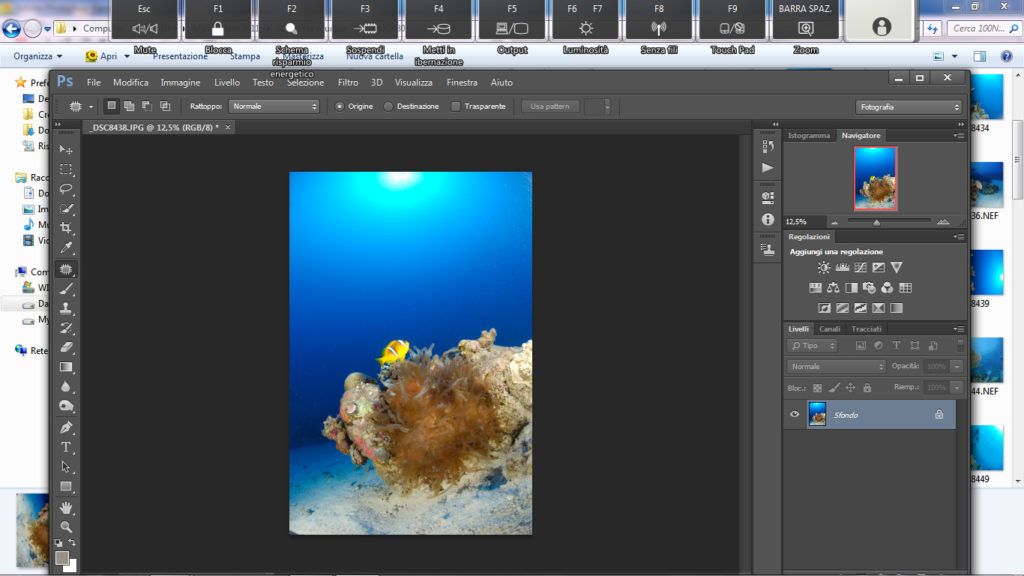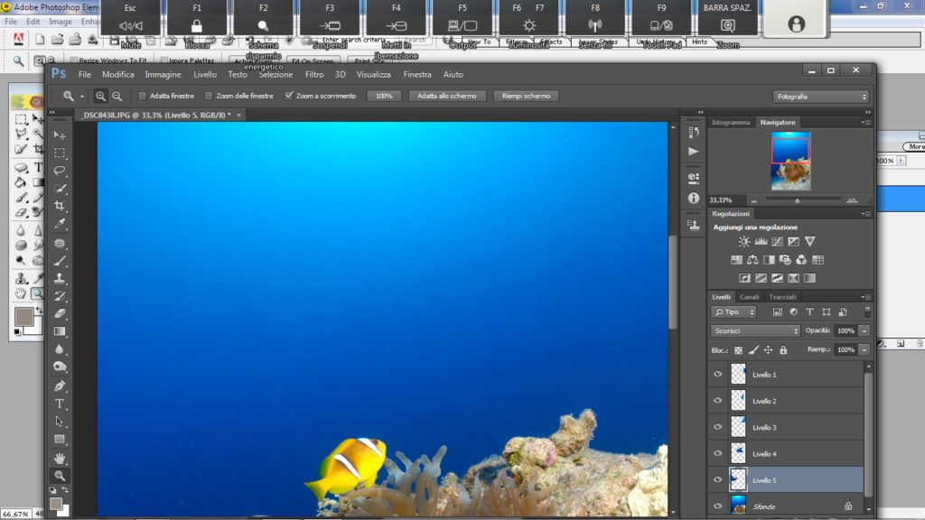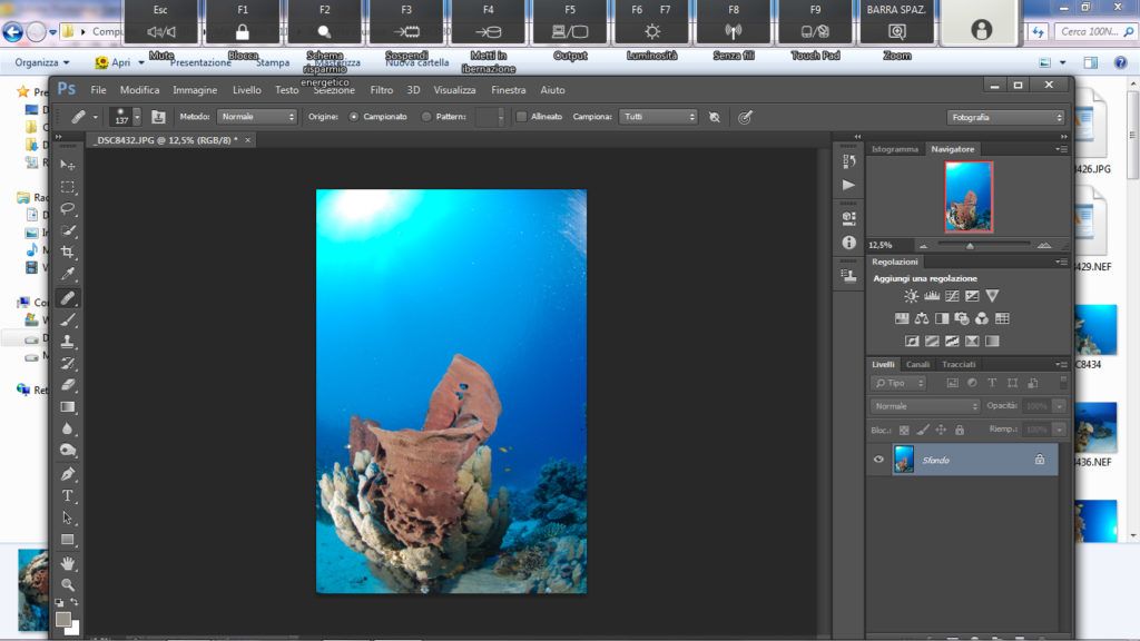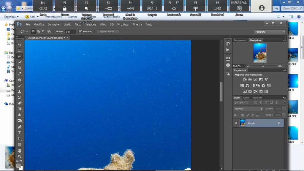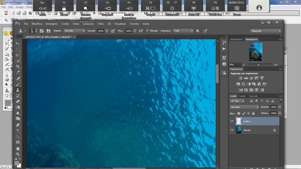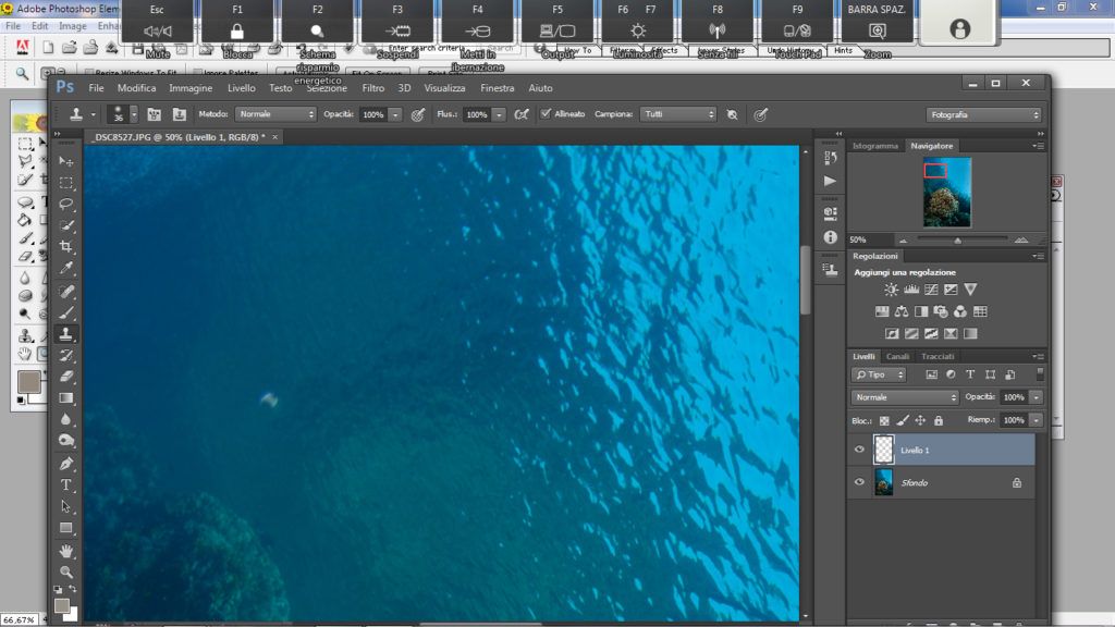 Questo metodo è utile nella fotografia ambiente quando si ha sospensione un po’ distanziata ma su tutto il blu. Questo è un metodo più complesso rispetto agli altri. Per prima cosa selezioniamo lo strumento “lazo” andiamo a selezionare l’area o una porzione di essa se l’area da correggere è ampia, attenzione a non selezionare rocce o pesci, ora facciamo il classico copia e incolla (ctrl+C, ctrl+V) così Photoshop creerà un livello con la parte selezionata, ora su questo nuovo livello andiamo a cambiare il metodo da “normale” a “scurisci”, fatto questo prendiamo lo strumento “sposta” e selezioniamo il livello che è stata creato e spostiamo la selezione in alto o in basso a piacimento con le frecce “su” o “giù” presenti nella tastiera finchè la sospensione non scompare.