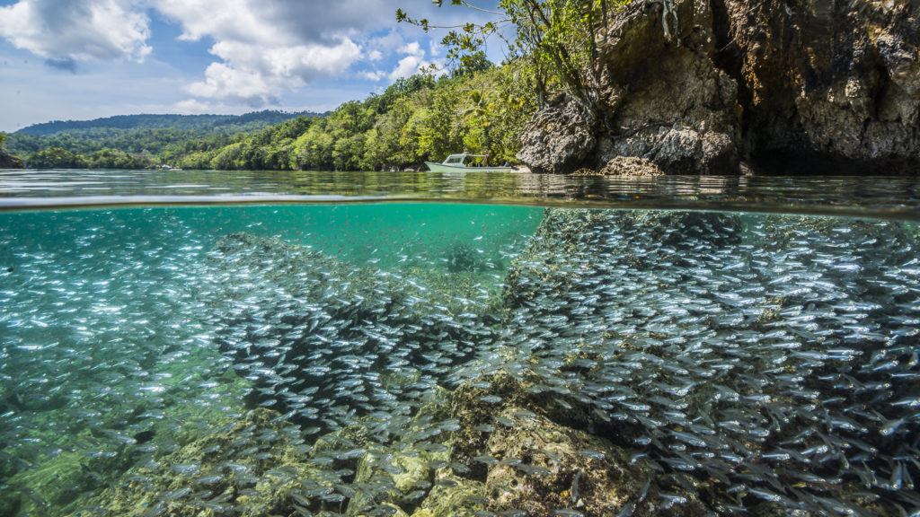 È ovvio che l’uomo sia toccato da questa enorme quantità di pesce. I giganteschi banchi di acciughe sono rari in tutta la zona dei tropici ma non in Triton Bay. Quando l’attività dei banchi di pesce raggiunge il culmine i pescatori locali ancorano i loro bagan (piattaforme di pesca, vedi Scubazone n. 3 e n. 9, SZ3 SZ9) nello stretto di Iris e iniziano a pescare di notte, con lampare che concentrano le acciughe e attirano anche predatori più grandi, come lo squalo balena (che è possibile fotografare immergendosi accanto ai bagan).