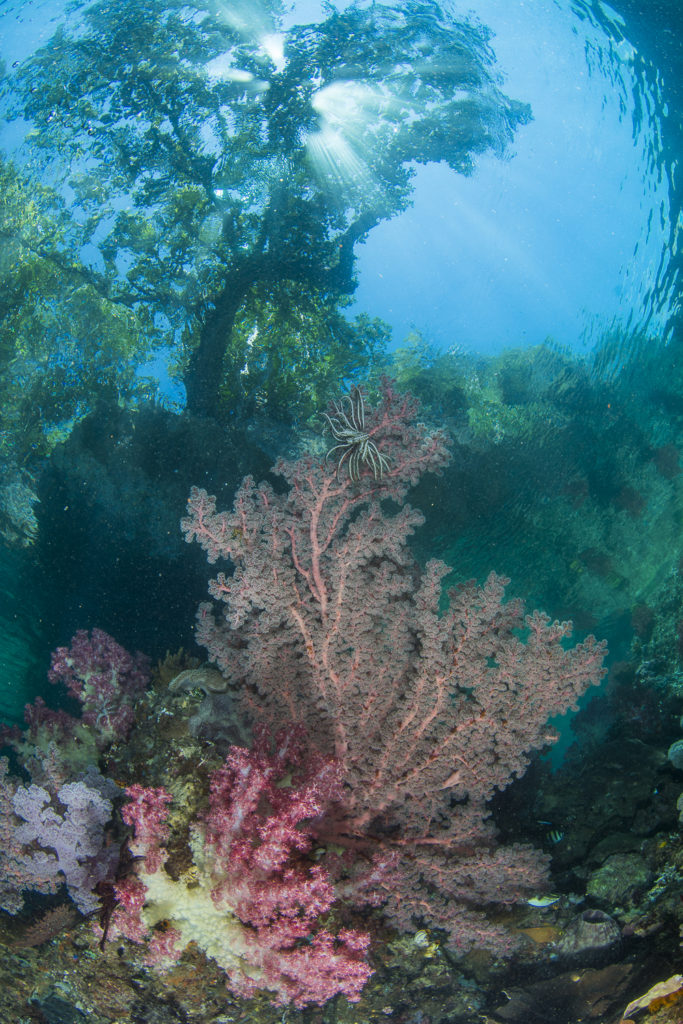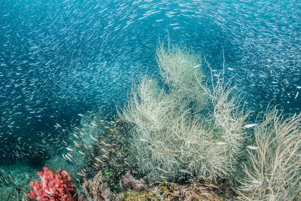 Proprio questo equilibrio dinamico, tra risalita di acque fredde e limpide e discesa dai fiumi di acque torbide rende l’area così interessante e stimolante per il fotografo. Le condizioni di luce naturale variano lungo l’intero spettro, da tinte pastello a basso contrasto nelle acque torbide a colori pieni e saturi nell’acqua limpida. In particolare è l’acqua torbida, così temuta in generale dalla comunità dei subacquei, insieme alla luce del sole su questa ricchezza lussuriosa di colori e forme, a dare sott’acqua una sensazione quasi psichedelica. A volte si ha la sensazione di immergersi in un mistico, favoloso paese delle meraviglie. In particolare la combinazione giardini di corallo nero dai polipi bianchi – enormi banchi di pesce è sicuramente il marchio di fabbrica della Triton Bay. Mi richiama alla mente la prima brina invernale in Austria, con la visione paradossale dei banchi di pesce al posto degli stormi di uccelli, che volano sopra questa foresta congelata.