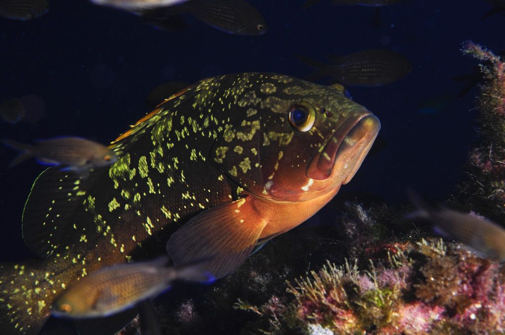 Durante le nostre pinneggiate saremo accompagnati ed avvolti da nuvole di castagnole (Chromis chromis), boghe (Boops boops), occhiate (Oblada melanura) e saraghi fasciati (Diplodus vulgaris), mentre sotto di noi, in ogni interstizio e pianoro, potremo ammirare cernie brune di qualunque taglia (Epinephelus marginatus) poggiate sul fondo con il muso rivolto vero il mare aperto che si sposteranno con eleganza al nostro passaggio. Gettando uno sguardo verso il blu potremo anche osservare numerosi esemplari di grossa taglia di dotti o cernie dorate (Epinephelus costae) che si lasciano osservare serenamente se il nostro avvicinamento procederà con lentezza e quasi con indifferenza. E’ proprio questa una delle tecniche migliori per avvicinare qualunque pesce; in particolare con i grossi banchi, procedendo lentamente e parallelamente al loro percorso senza spaventarli, modificando via via l’angolo di avvicinamento, ci potremo ritrovare magicamente in mezzo a loro e restarci finché i nostri movimenti rimarranno lenti e in armonia con quelli del banco.