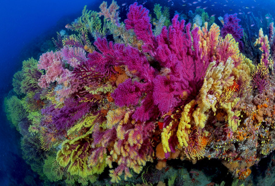 I colori dominanti di questi indescrivibili ambienti sottomarini sono il giallo e il rosso; un celenterato coloniale appariscente e abbondante è il responsabile di tali intensi cromatismi: la gorgonia Paramuricea clavata. Un fondale mediterraneo così colorato non lo si trova certo con facilità.