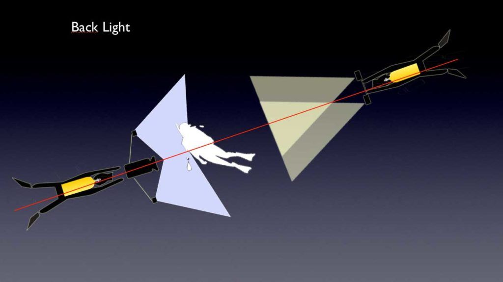Il back light o controluce è un effetto molto ricercato sott’acqua, si ottiene mettendo dietro il soggetto principale una luce in asse con l’obbiettivo della telecamera o con una inclinazione, serve a contrastare il soggetto rispetto al fondale omogeneo, si può usare anche la luce del sole per questo effetto, provate, i risultati sono notevoli.