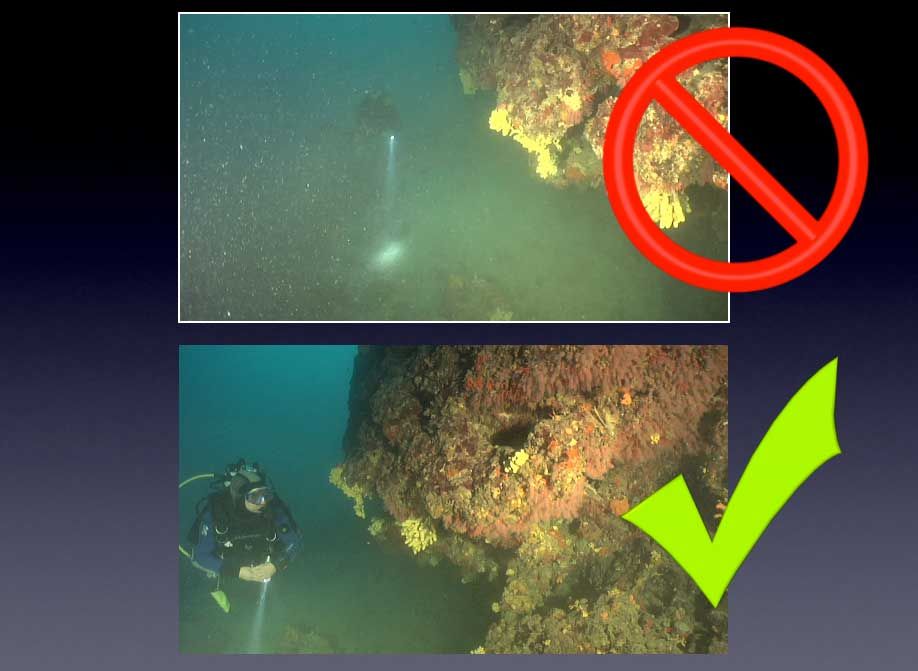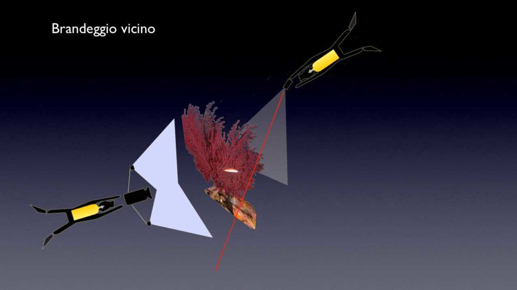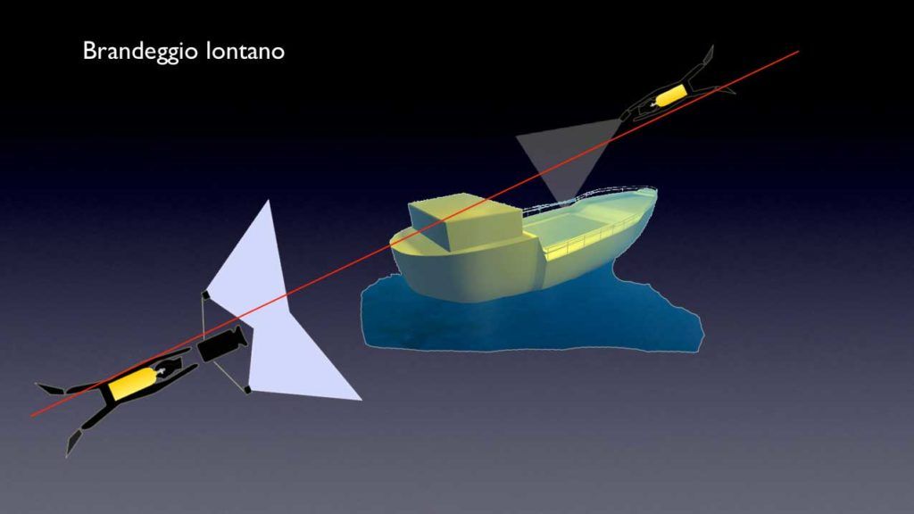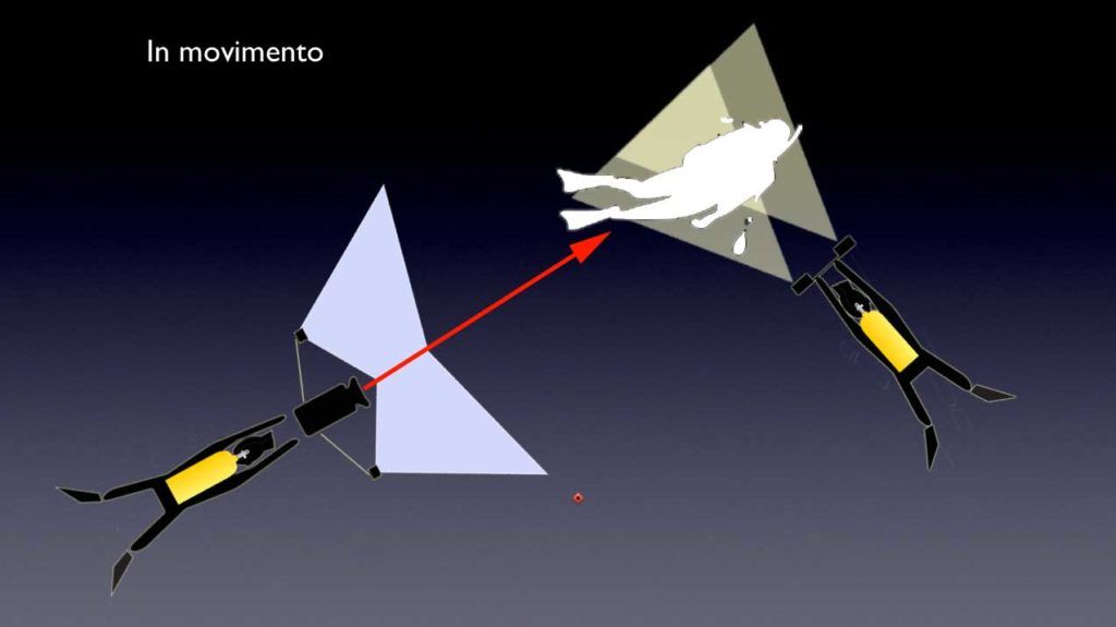 Alcuni compagni con torcia all’interno della scena che sto riprendendo posti su piani diversi restituiranno profondità di campo all’immagine e proporzione in caso di riprese su relitto, questa tecnica in gergo viene chiamata brandeggio.