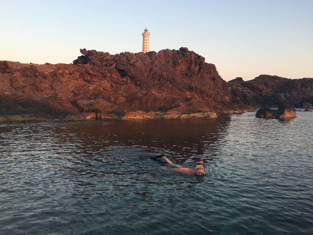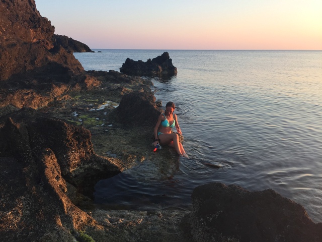 Prima tappa: la granita di Felice! Non vuoto neanche le valigie, mi ci vuole subito di riassaporare una granita di gelso e sentire sulla pelle il profumo dell’isola. Con la granita in mano si siedo davanti a quel mare e finalmente entro in modalità “vacanza”. Ustica è un’isola vulcanica che ha avuto origine un milione di anni fa per la risalita di magmi profondi da una frattura distensiva del Basso Tirreno. Quello che si vede all’esterno è solo la vetta di una profonda montagna subacquea che si erge solitaria in un mare limpidissimo e ricco di plancton e nutrienti che attirano i pesci pelagici e nutrono i bentonici. Non ci sono spiagge di sabbia, ma molte calette a cui si accede grazie a scenografici sentieri scavati in mezzo alle rocce. Non sempre i sentieri sono immediatamente visibili ma quando li scopri e ti portano al mare l’emozione è ancora più grande. Le insenature consentono privacy ed intimità ed anche in piena estate si può trovare uno scoglio “privato” su cui fare la sirenetta, leggere un buon libro (suggerisco il gabbiano Jonathan Livingston o Oceano Mare che vi ispireranno senz’altro in questi luoghi) o… beh lascio le alternative alla vostra immaginazione! Tra una… ehmmm… pagina di libro (o effusione) e l’altra non potete assolutamente mancare di snorkelare tra gli scogli affioranti. Detto tra noi, l’acqua è talmente limpida che vedrete pesci ed organismi marini anche dalla superficie all’asciutto, ma volete mettere il piacere dell’acqua rinfrescante e di nuotare proprio dentro un acquario. Ovviamente io ho messo la testa in acqua già il primo pomeriggio, subito dopo la granita di cui sopra (impossibile resistere… ad entrambe). Il cielo aveva già assunto i colori caldi e dorati tipici del tramonto ed in terra come in mare, quel periodo che intercorre tra il giorno e la notte è sempre il più calmo e rilassante. Preparo maschera e pinne ed entro in acqua. Caspita, è caldissima! In superficie ci sono 27/28 gradi… temperature tropicali direi. Nei primissimi centimetri (si avete capito bene, proprio centimetri) vedo tutta una fila di pomodori di mare che altro non sono che dei bellissimi anemoni (Actinia equina). Poco più in profondità ci sononumerose attinie (Anemonia sulcata). Eh già, sono entrambi parenti di quelli che ospitano i pesci pagliaccio! Mi allontano solo di poco da quello scoglio e vedo nuvole di castagnole azzurro-nere. Stanno cambiando livrea dall’azzurro fluo dei giovani al nero degli adulti e sono veramente fantastiche. Mi lascio avvolgere da loro… chi se ne frega, potrei anche stare qui per sempre! Vengo distratta da una bavosa. E’ su una roccia, a meno di 50 centimetri di profondità, serenamente adagiata su un prato di alghe. Mi fermo davanti a lei cercando di non spaventarla. Mi guarda con quegli occhi grandi e la faccia simpatica. Dopo diversi minuti, mi rendo conto che forse sono un po’ indiscreta e la lascio sola. I blennidi, chiamati anche bavose, si trovano in tutti i mari e vivono sul fondo, avendo perso del tutto la vescica natatoria. Il loro nome volgare di bavosa è dovuto al fatto che non hanno più le squame e sono avvolte da abbondante muco che le protegge anche fuori dall’acqua per brevi periodi. Proseguo la mia passeggiata in acqua leggermente più profonde. Ci sono buchi e grotte tra gli scogli e notogranchi e gamberi che cominciano e venire fuori per la ricerca notturna di cibo. Ci sono piccoli saraghi e gruppi di salpe che mi sfilano accanto senza nessun timore. La costante è certamente questa totale assenza di paura dei pesci dovuta sicuramente all’area marina protetta ed al rispetto che viene dato loro. Beh è tardi, ormai il sole si è tuffato in mare ed è ora di uscire anche per me… mi aspetta un ottimo aperitivo a base di prosecco! Anche questa parte della vacanza è molto importante…