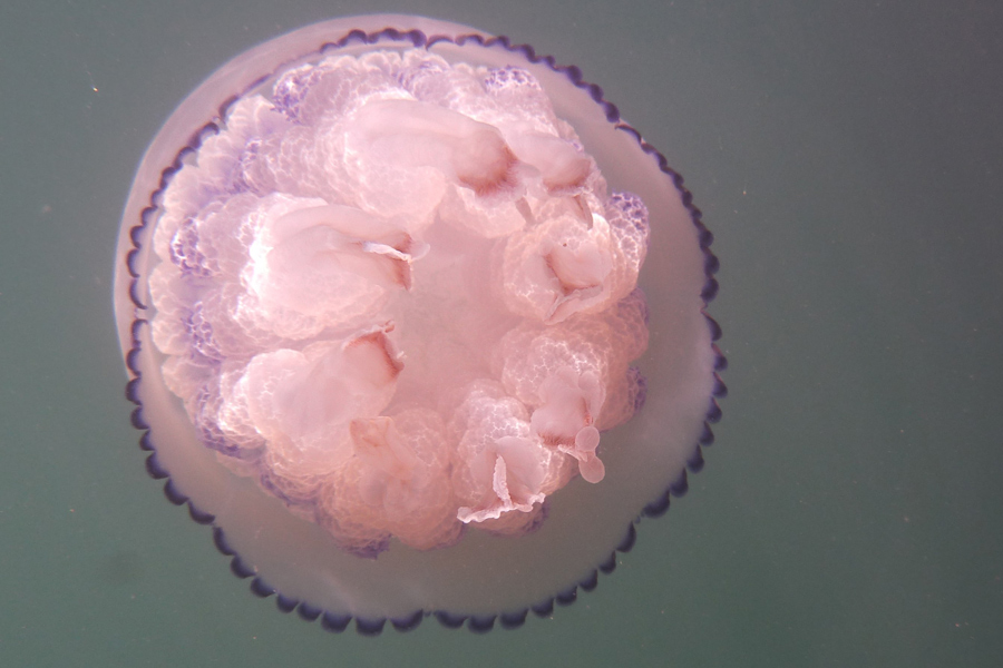All’improvviso noto sulla mia destra, un enorme alone bianco: “ecco”, mi ripeto mentalmente, “siamo alle solite, monto un 60 macro e mi trovo davanti un Polmone di Mare da 5 kg dove mi occorrerebbe un Wide”. Si tratta di una Rhizostoma pulmo (medusa detta “polmone di mare”) di notevoli dimensioni, con un cappello opalescente di almeno 40 cm di diametro.