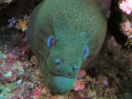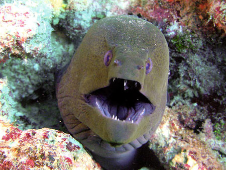 Una Gymnothorax javanicus alquanto infastidita dallo scafandro della macchina fotografica. Sembra dire: Beh? Che cavolo vuoi? |