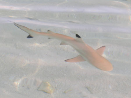 Dei piccoli di squalo pinnanera si aggiravano sulla riva a caccia di pesciolini. |