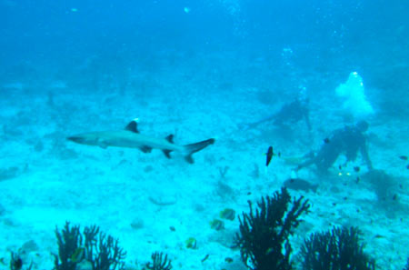 Di sovente gli squali di barriera sono incuriositi dagli uomini e compiono dei giri intorno ad essi. |