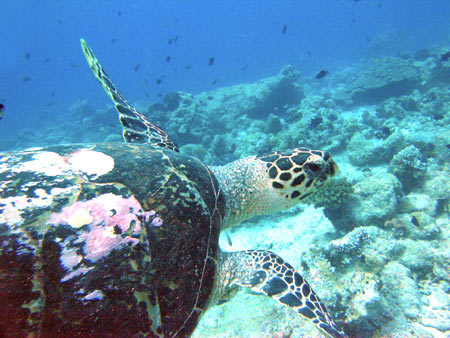 Un altro punto forte delle Maldive è la varietà di incontri che si possono fare. Durante l’immersione l’incontro con piccoli squali di barriera è quasi matematica, murene con la testa grossa come un cane che si lasciano accarezzare sono praticamente in ogni buco e con un po’ di fortuna si possono incontrare testuggini, delfini, aquile di mare, squali grigi e mante (ed in alcuni periodi e con apposite spedizioni addirittura squali balena).